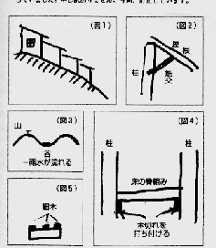 次に、すでに立てた柱に平行に、それより低い柱を立て、高い方から低い方へ材木を差し渡し、さらにそれらに直角に角材を数本打ち付け、その上にトタンを張れば屋根のできあがり。切り込みは不要、クギやカスガイで十分。ただし筋交(すじかい)は必要(図2)*図1~5
